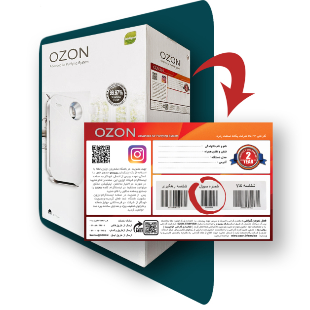 با سپاس از اینکه به خانواده ی OZON پیوستید . جهت فعالسازی گارانتی خود و استفاده از خدمات رایگان و پشتیبانی قطعات لطفا فرم زیر را با اطلاعات صحیح خود تکمیل نموده و مدل دستگاه تصفیه هوا و شماره سریال روی کارت گارانتی که روی جعبه چسبانده شده را مطابق با تصویر در فرم زیر وارد نمایید . ( در صورت مفقود شدن جعبه یا مخدوش شدن کارت گارانتی هیچ جای نگرانی نیست شماره سریال شما پشت بدنه دستگاه نیز حک شده است.)